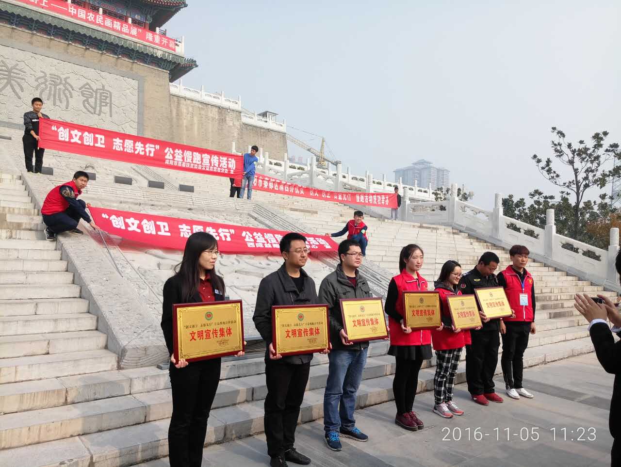 到達(dá)終點(diǎn)后,所有參與團(tuán)體于在清渭樓前集合。城投集團(tuán)志愿者服務(wù)隊(duì)代表領(lǐng)取了由咸陽市慈善扶貧協(xié)會公益志愿者分會頒發(fā)的榮譽(yù)證書,最后全體志愿者們合影留念,記錄下了這寶貴的一刻。