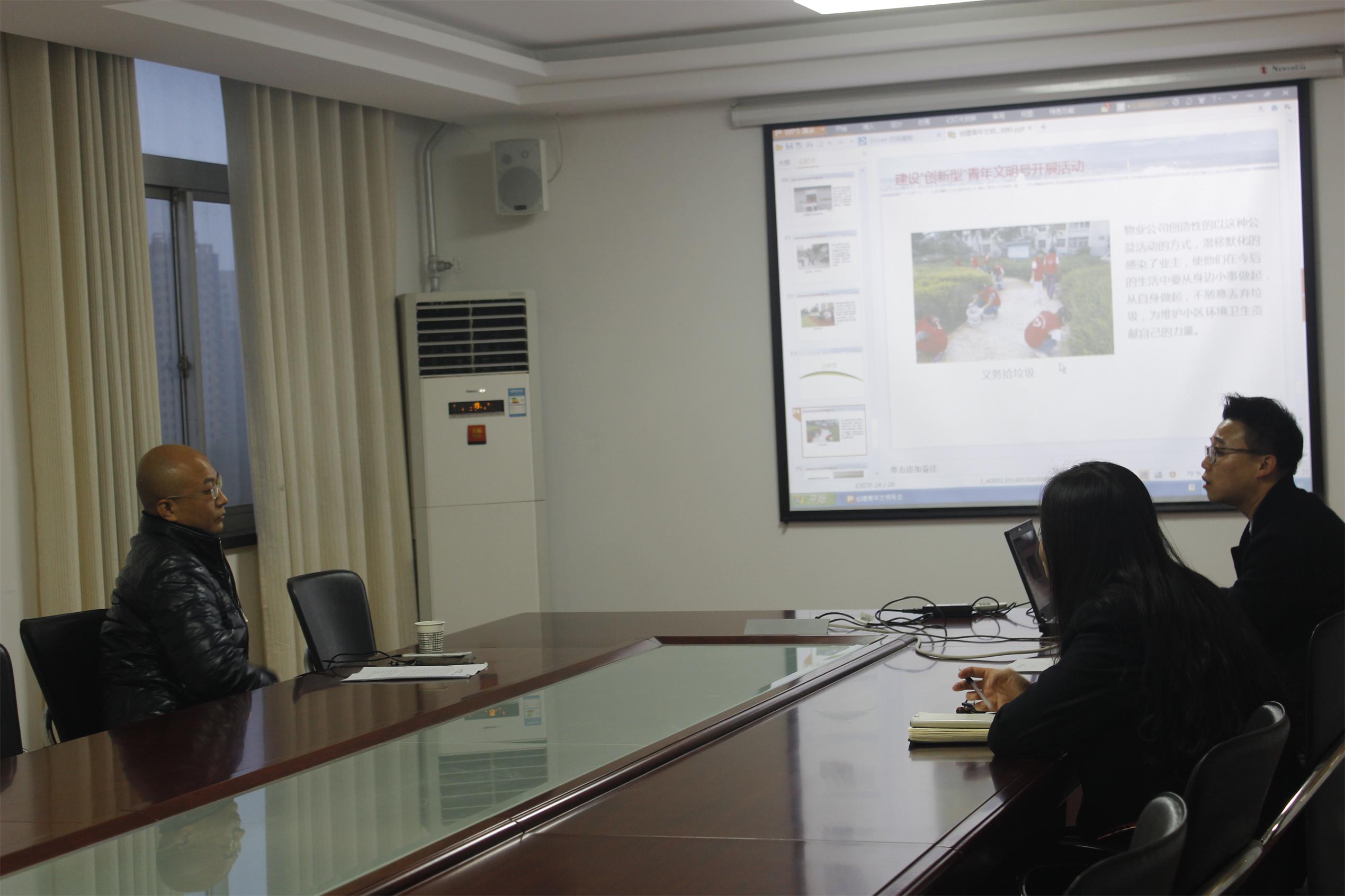 物業(yè)公司工會(huì)主席常紅艷,團(tuán)支部書記王崇屾代表公司干部員工對(duì)顧李斌一行的到來(lái)表示熱烈的歡迎。隨后王崇屾代表創(chuàng)建小組向檢查組匯報(bào)了物業(yè)公司近一年來(lái)創(chuàng)建工作的開展情況,匯報(bào)后,檢查組又對(duì)物業(yè)公司創(chuàng)建工作的有關(guān)資料和宣傳設(shè)施進(jìn)行了檢查。