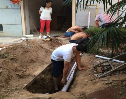 時間已近十二點,維修人員顧不上吃飯休息,歷時一個多小時開挖地面一米左右,查找出了問題管網(wǎng),該段管網(wǎng)發(fā)生斷裂,必須斷水進行更換維修。為了盡快完成維修,不影響業(yè)主正常生活,維修人員頂著烈日,在又小又臟又悶熱的地洞里進行搶修,最終在下午五點順利完成了維修工作,恢復了正常用水。